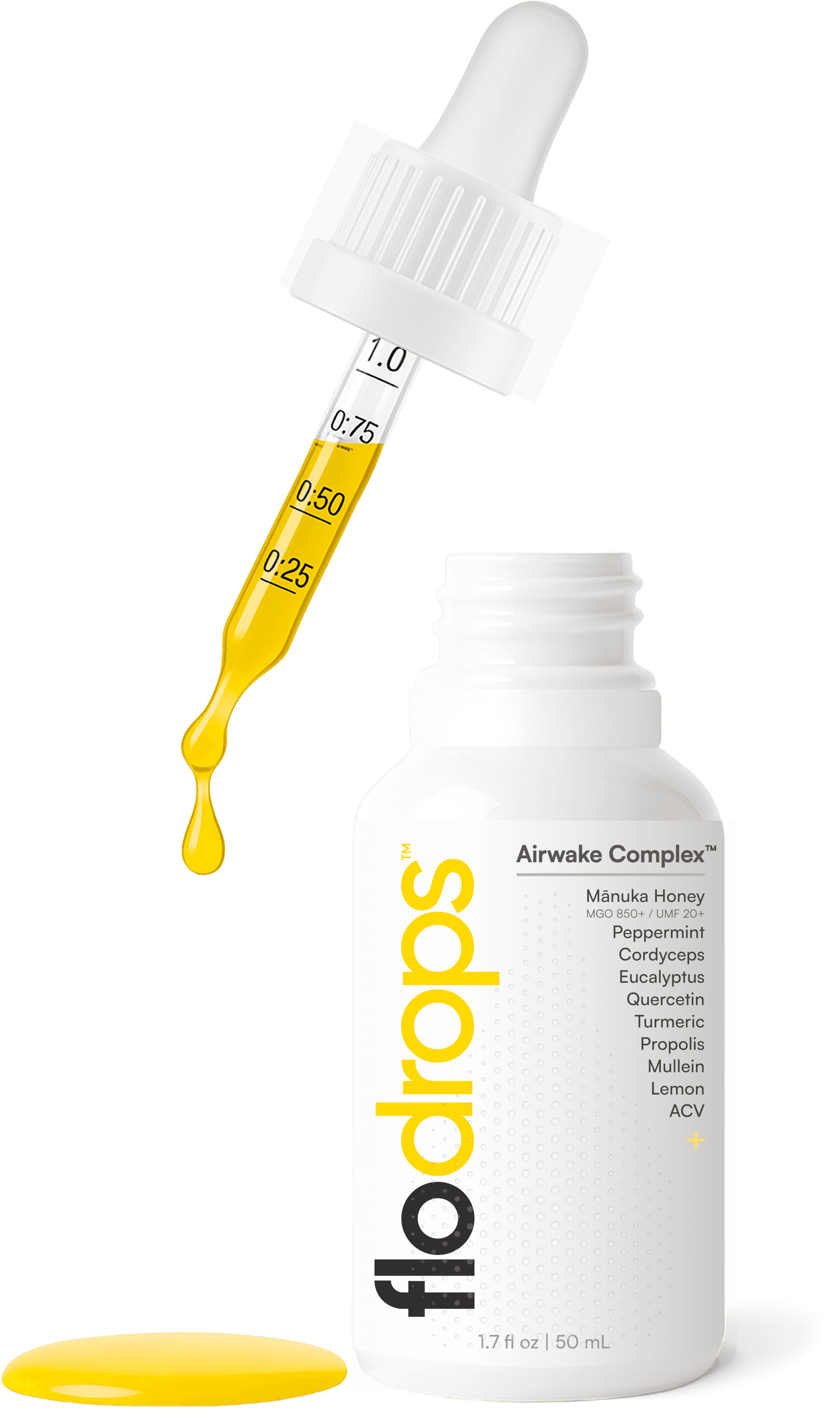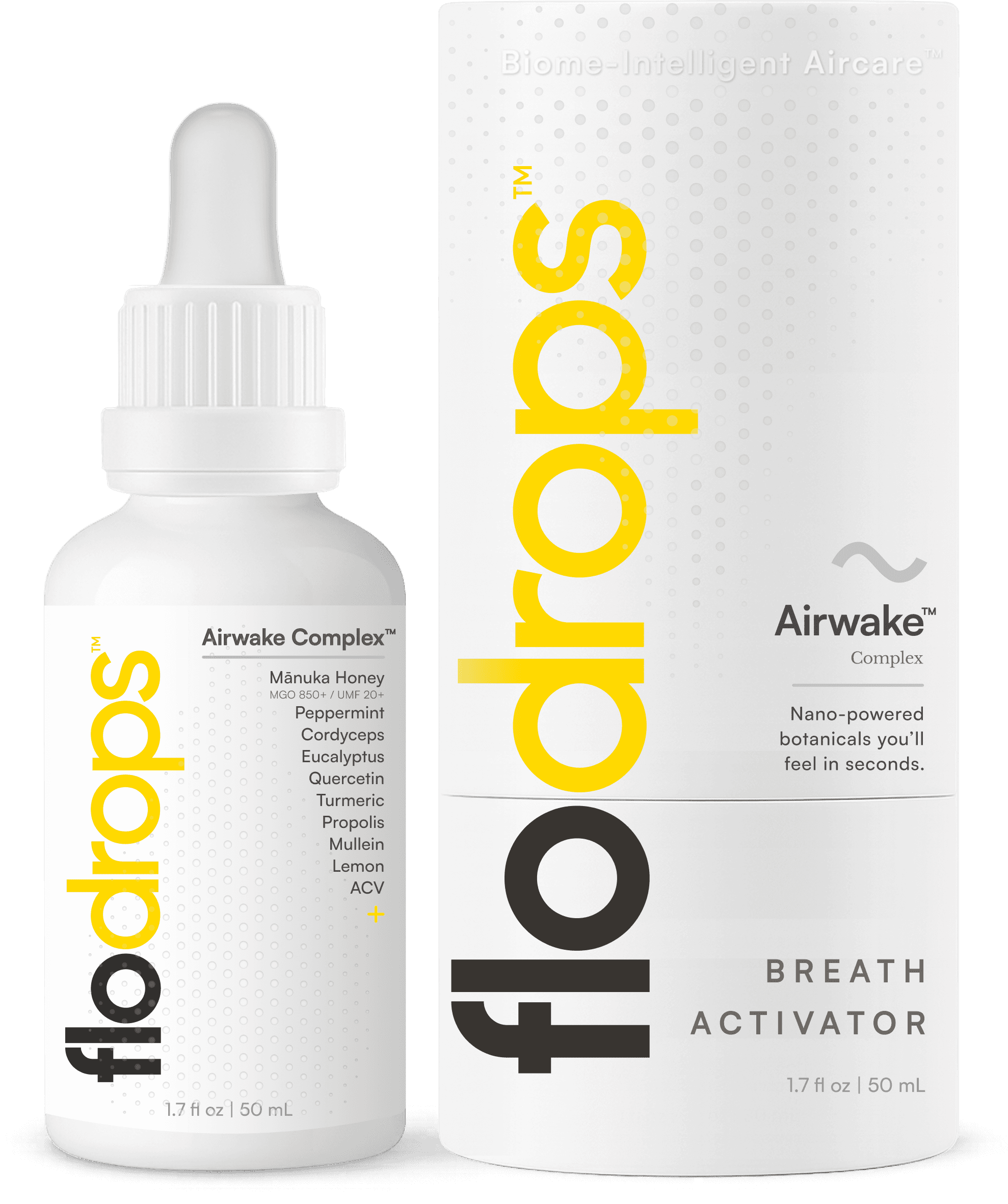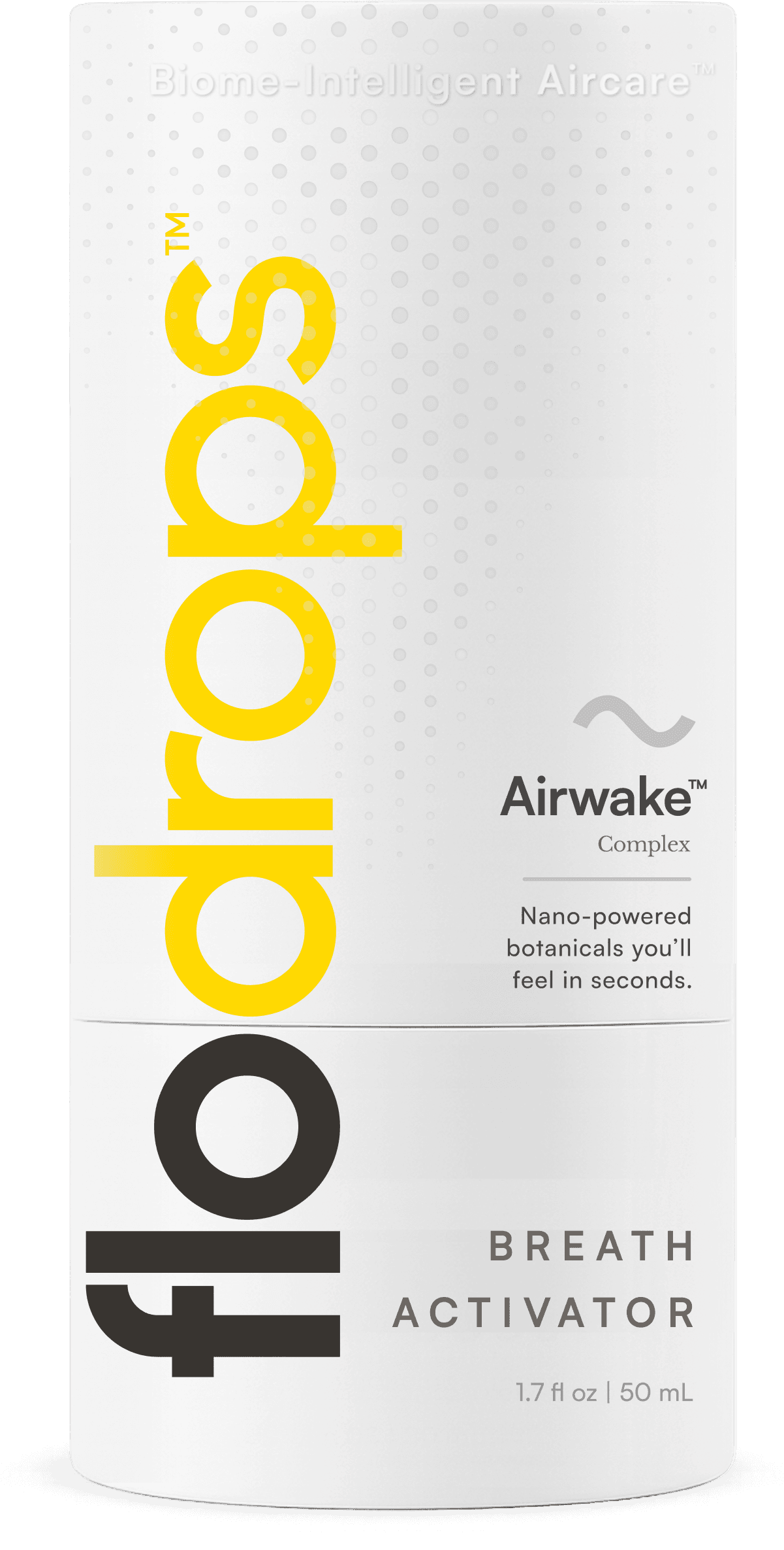Flo Drops™ contains a broad spectrum of 16 breath-path botanicals that work synergistically to support breath-first performance and microbiome balance. Using advanced nanoencapsulation technology, each drop is optimized for rapid airway absorption and maximum bioavailability. Phospholipids from sunflower lecithin naturally carry oil-based actives in a smooth water base, creating a seamless delivery you can feel through clearer airways, smoother breathing, and balanced energy.